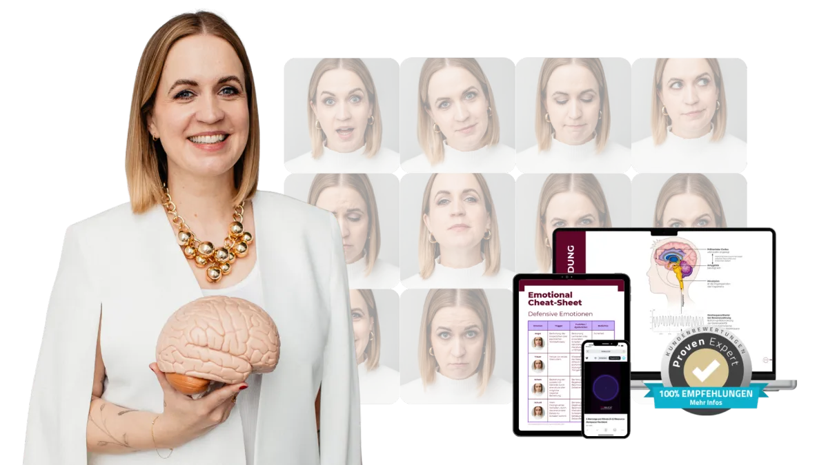 Was beinhaltet der Kurs? 90 Minuten Videomaterial, Mimikscouting-Training, kompakte Emotional Cheat-Sheets und gezielte Übungen für die Umsetzung im Alltag.